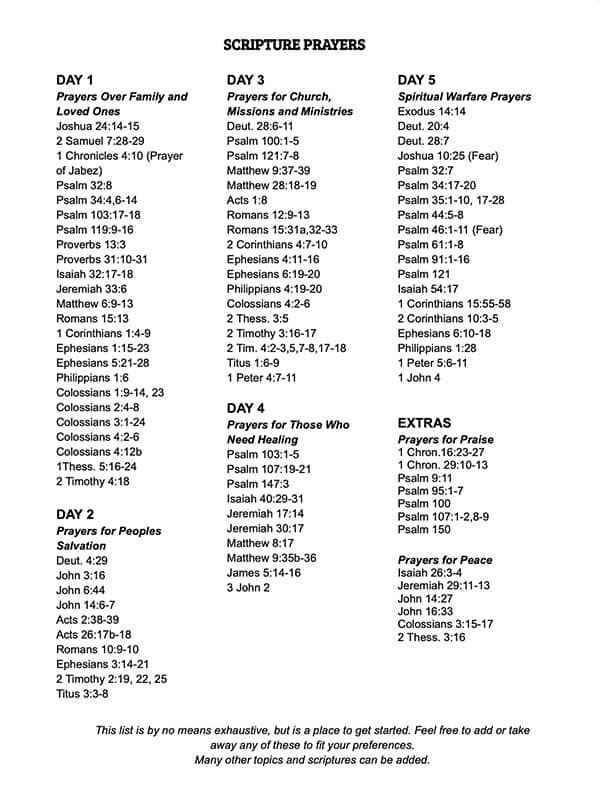 As described by Valerie Long in this Bible Memory Goal interview, a Prayer Bible is a specific Bible used to help guide your personal prayer time with the Lord. Each day is set aside for a specific focus (prayer for family, prayer for healing, prayers for spiritual warfare, etc.) and Bible verses are listed for each day. This kind of setup not only gives you structure to know who to pray for each day, but the Bible verses provide specific words you can use as you speak to the Lord.